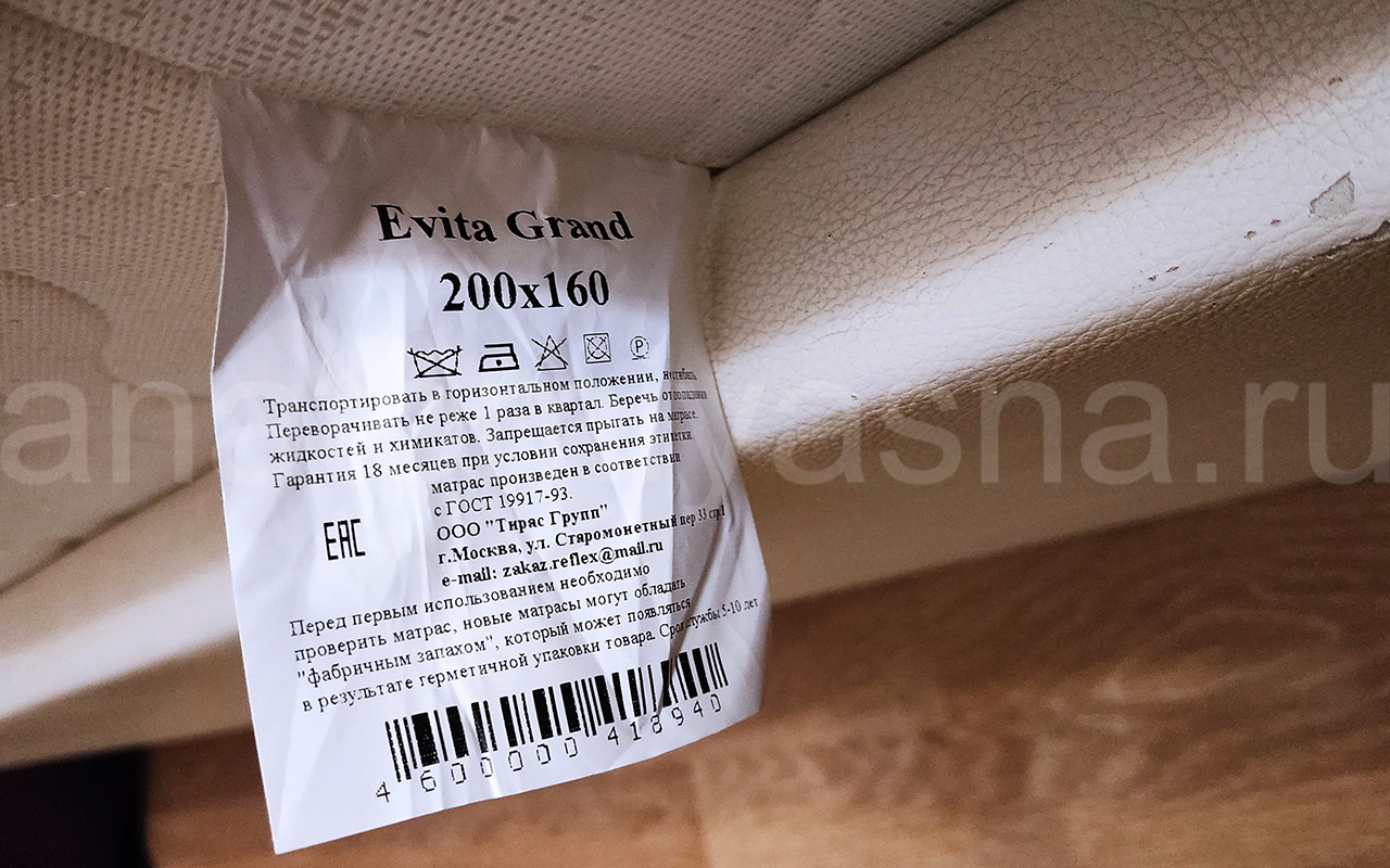 Заказ: 1853815. Добрый день! Хочу оставить отзыв о чудо-матрасе, который мы приобрели в магазине "Анатомия сна". Матрас Evita regular relax H-4 160×200 хорошей твердости, качественный, высокий . Доставка быстрая, без проблем в день договорённости, подняли на этаж. Спасибо Вам!